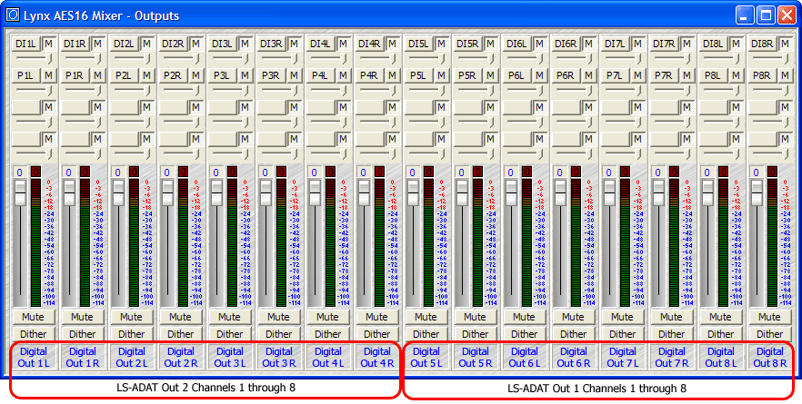 For the AES16, all 16 Lynx Mixer output channels already route to physical outputs on-board, so the LS-ADAT outputs will run in conjunction with the AES/EBU outputs on the AES16. The default routing is for LS-ADAT Out 1 to come from Lynx Mixer output channels 9 through 16, which in turn come from Play devices 5 through 8. The default routing for LS-ADAT Out 2 comes from Lynx Mixer output channels 1 through 8, which in turn come from Play devices 1 through 4. For example, if audio is sent to Play 5 from an audio application, this signal will be routed to the LS-ADAT Out 1 Channels 1 and 2, as well as AES16 Digital Out 5 Left & Right. Audio sent to Play 1 from an audio application will be routed to the LS-ADAT Out 2 Channels 1 and 2, as well as AES16 Digital Out 1 Left & Right.
