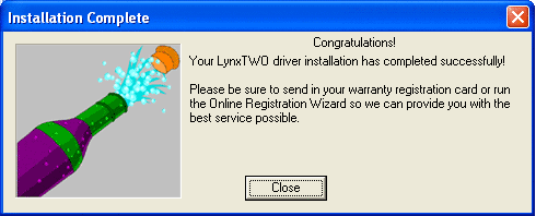 5. After copying files successfully, an Installation Complete window will appear. Click “Close”. The AES16 driver and Lynx Mixer application are now ready to use.
