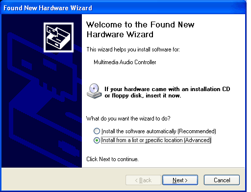 1. When you start Windows after installing the AES16 into your computer, the New Hardware Wizard will appear. Select “Install from a list or specific location” and click “Next >” to proceed (NOTE: In Windows 2000, click “Next>” on the New Hardware Wizard welcome screen, on the Install Hardware Device Driver dialog box, choose “Display a list of the known drivers for this device” and click “Next>”).
