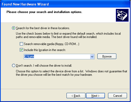 2. From the next window, select "Include this location in the search”, and type C:\Lynx in the data field. Click "Next >" to proceed (NOTE: In Windows 2000 select “Specify a location” to locate driver files, and click “Next>”. From the next screen click, type C:\Lynx in the data field, then click “OK”. When the wizard finishes searching for the appropriate driver click “Next>”).p?