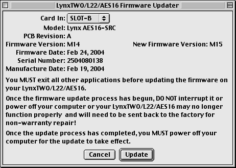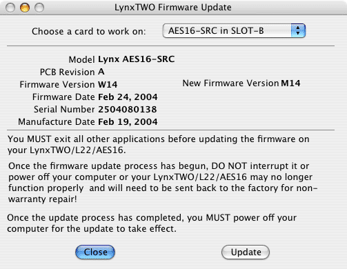 For Macintosh compatibility, the firmware stored in the on-board flash memory must be updated prior to use. This is required because the Lynx card ships from the factory with Windows firmware installed. To update the firmware:
