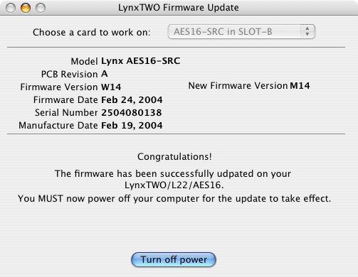 For Macintosh compatibility, the firmware stored in the on-board flash memory must be updated prior to use. This is required because the AES16 ships from the factory with Windows firmware installed. To update the firmware:
