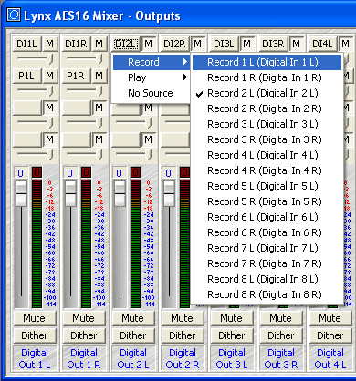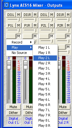 In the Lynx Outputs Mixer there are four Output Monitor Source buttons above the faders on each output channel. Please note: With Firmware Rev 25 for the AES16, or Firmware Rev 7 for the AES16e, and current Windows or OS X drivers, then 10 sources per output are available. A mouse click on one of these buttons launches a menu of record and playback sources. Selecting record sources cause input signals to be routed to the output, selecting play sources allow playback streams from a software application to be routed to the output. Combining record and play sources makes complex monitoring possible, such as headphone mixes.