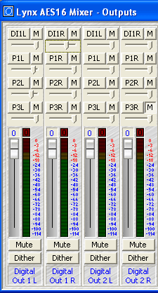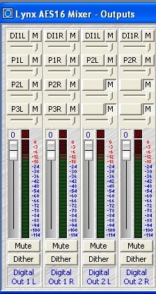 Now we will set up a monitor scheme whereby each singer can hear their own performances, as well as the three instrumental track sub-mixes. In the Lynx Outputs Mixer, we’ll start by assigning record monitor sources (inputs) for Output 1 Left & Right. The top Output Monitor Source select button for Digital Out 1 L & Digital Out 1 R is already assigned to Digital In 1 Left & Right (DI1L/ DI1R) as a factory default – we simply need to un-mute them by clicking the mute button next to each Output Monitor Source select button.