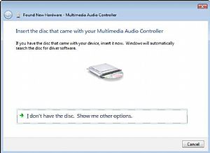 2. The system will unsuccessfully attempt to locate drivers via Windows Update. On the next screen, you will be asked to install a driver disk. Select “I don’t have the disc. Show me other options.”
