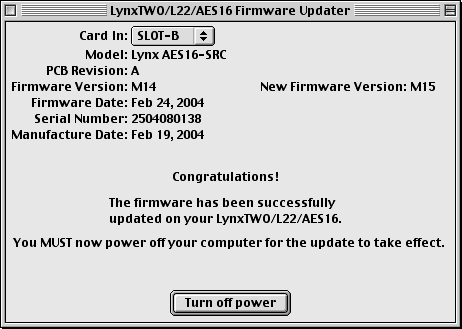 For Macintosh compatibility, the firmware stored in the on-board flash memory must be updated prior to use. This is required because the AES16 ships from the factory with Windows firmware installed. To update the firmware: