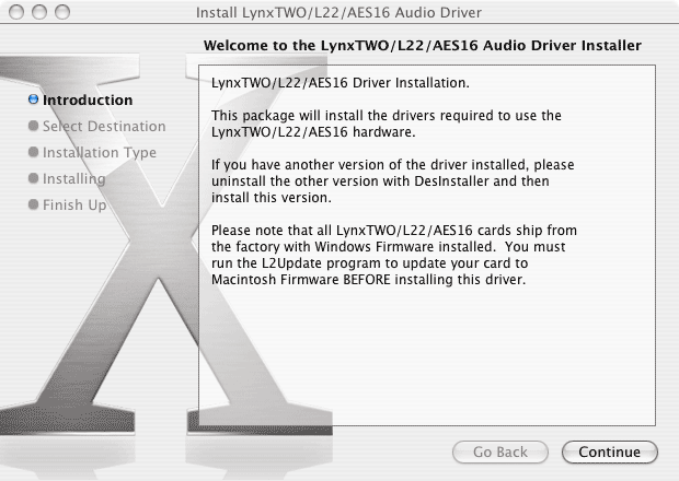3. Click “Continue” at the Install LynxTWO/L22/AES16 Audio Driver dialog box.