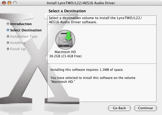4. When prompted to select a destination for the audio driver, click on “Macintosh HD” and then click “Continue”.