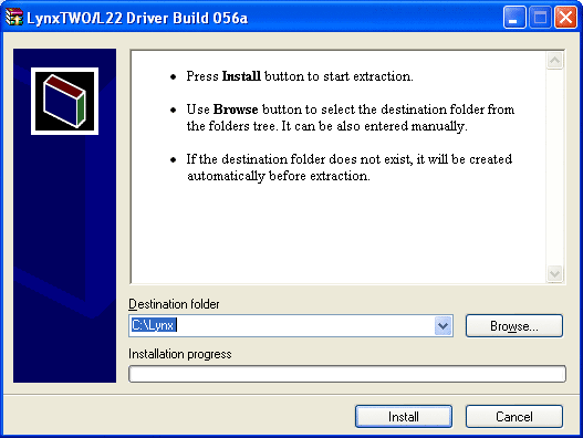 3. When prompted, accept the default driver destination folder (C:\Lynx) by clicking “Install”