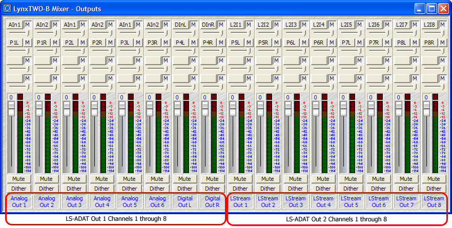 For the LynxTWO/L22, Lynx Mixer output channels 9 through 16 have no physical outputs on-board, so when you route audio from an application it will only be sent to the LS-ADAT output. Lynx Mixer output channels 1 through 8 already route to physical outputs on-board, so the LS-ADAT outputs will run in parallel with these analog and digital outputs. For example, if audio is sent to Play 1 from an audio application, this signal will be routed to the LS-ADAT Out 2 Channels 1 and 2, as well as Analog Out 1 and 2 on the LynxTWO/L22.