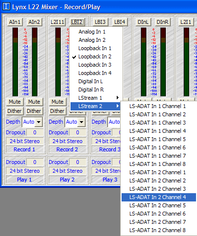 For a real world example, let’s say that you want to record audio from LS-ADAT In 2 channels 3 and 4. From the Lynx Record/Play Mixer, click the Left Input Source Select button at the top of the Record/Play 2 channel strip. Choose “LStream 2” > “LS-ADAT In 2 Channel 3” as the input source for the left channel, and “LS-ADAT In 2 Channel 4” for the right channel.